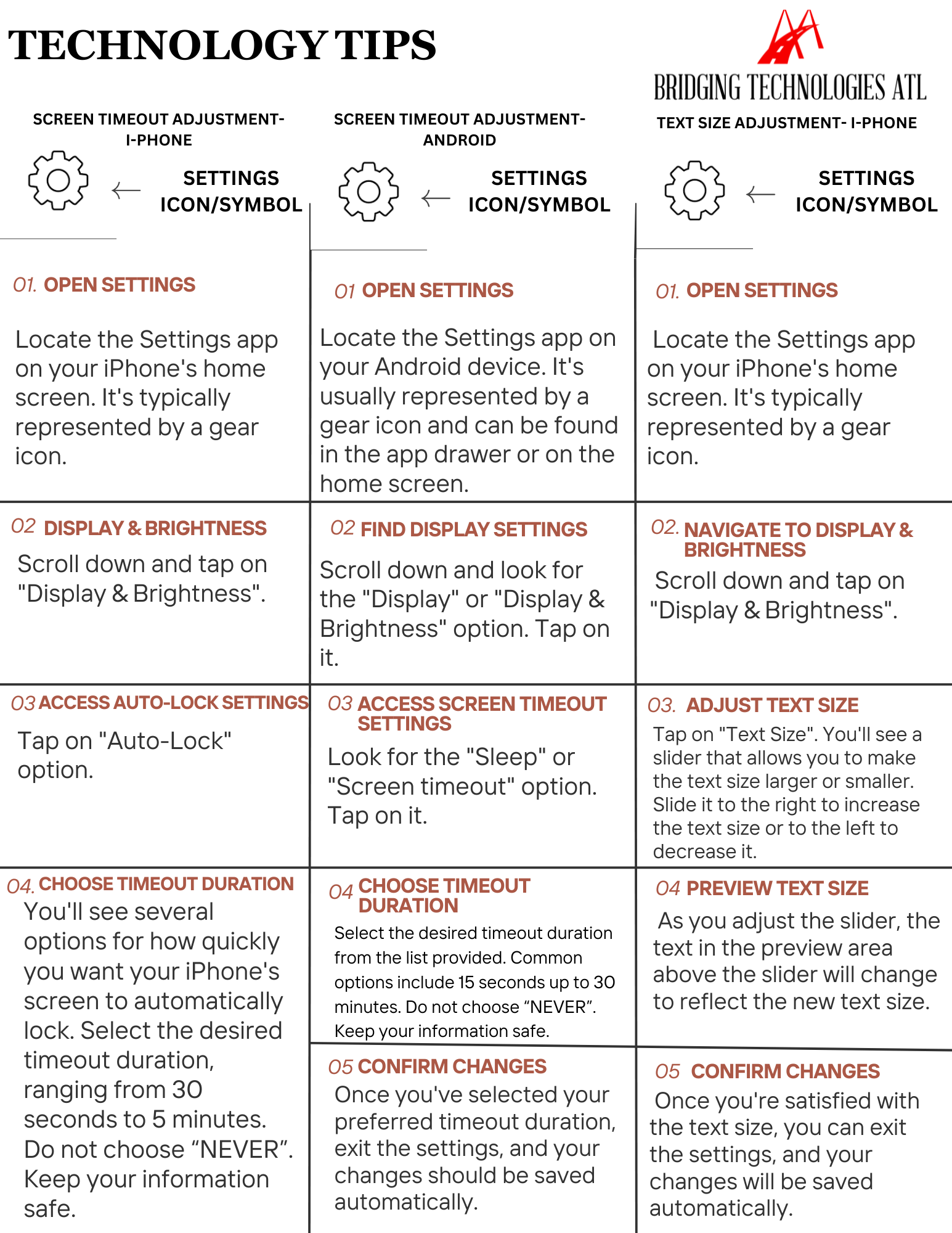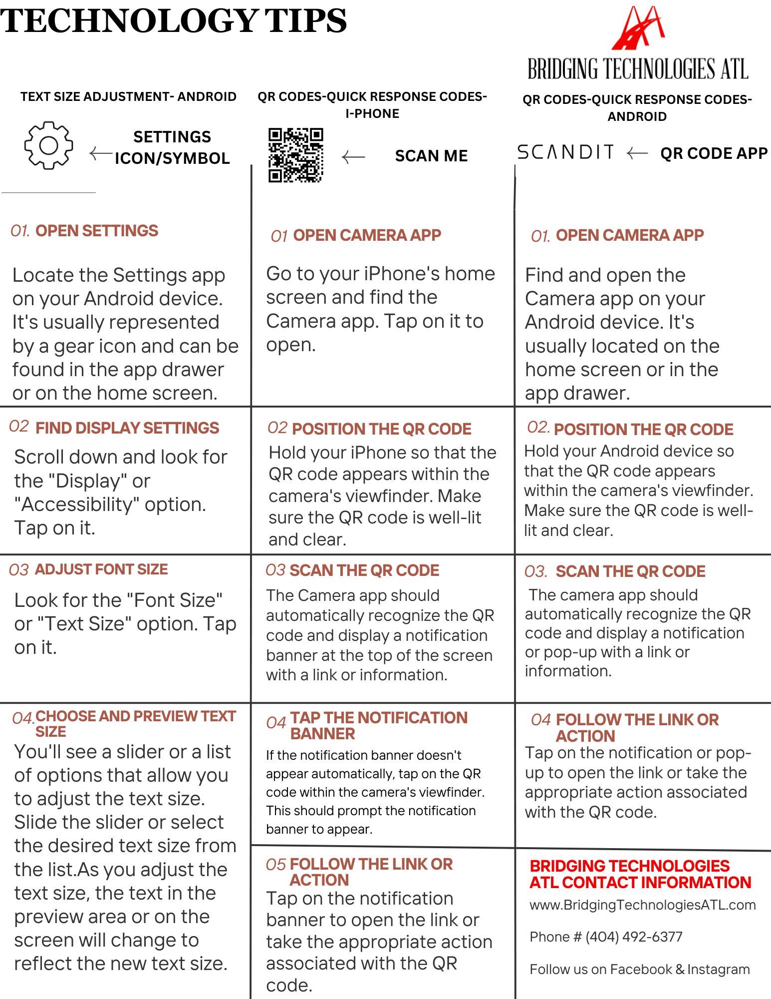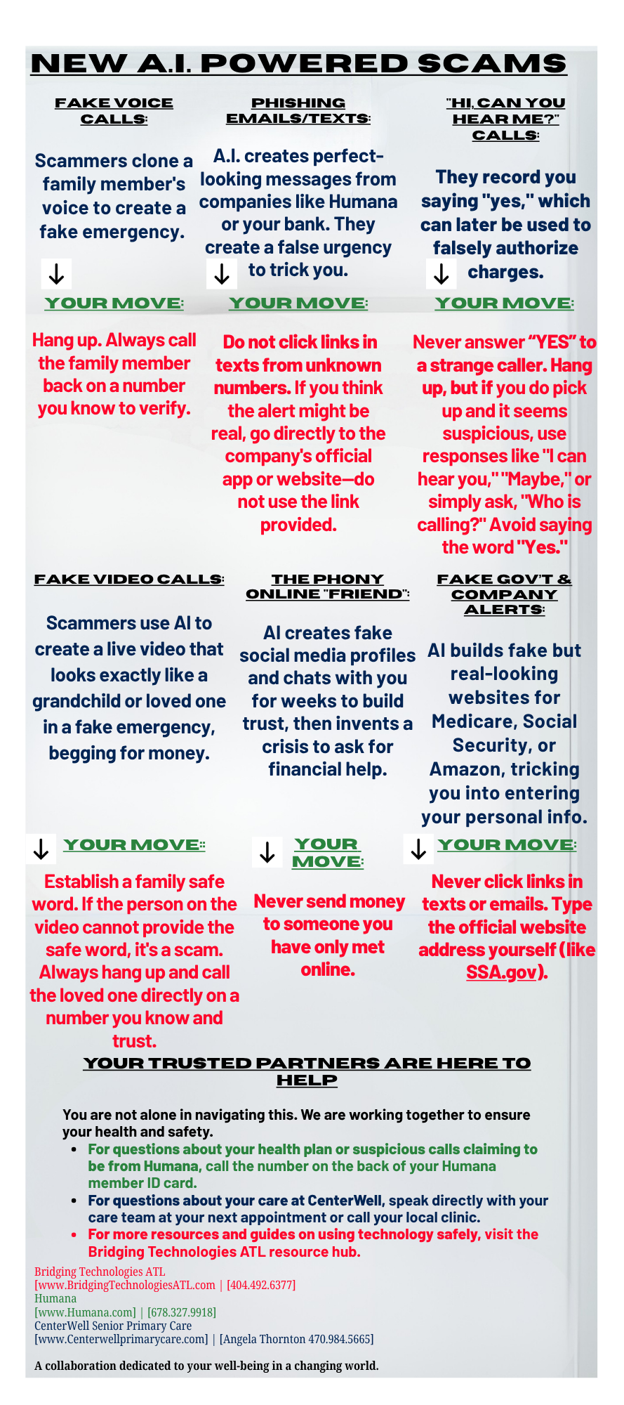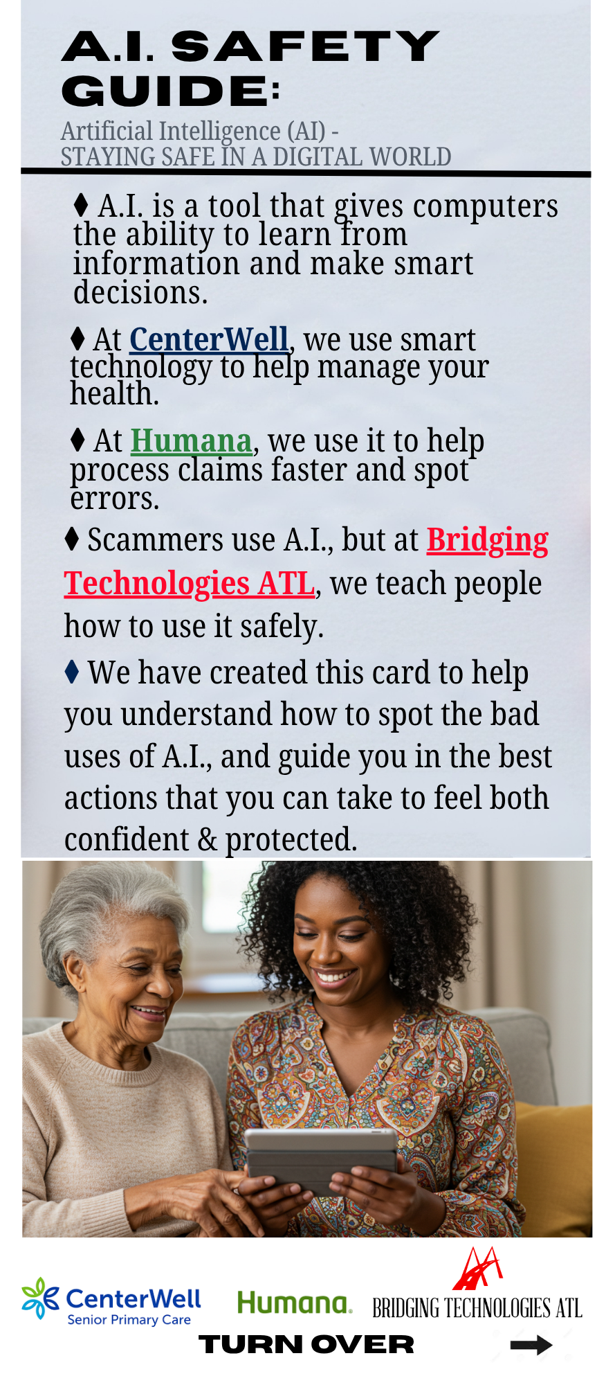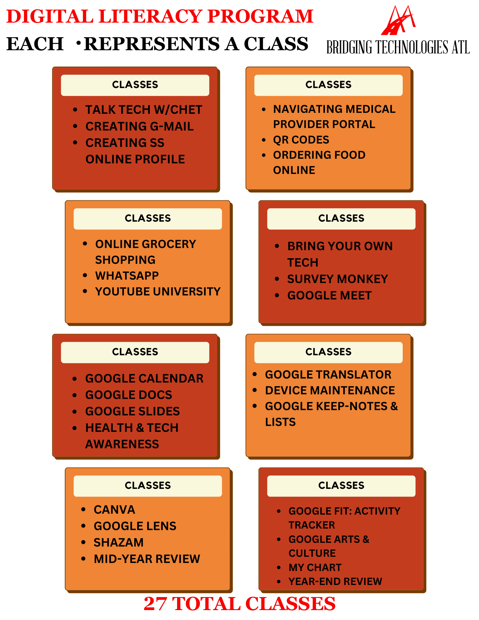 At Bridging Technologies ATL, our commitment to empowering communities includes a special focus on senior citizens through our "Digital Literacy Program." In partnership with senior primary care providers, local senior centers, community organizations, and technology providers, we offer tailored workshops and training sessions designed to help seniors navigate the digital world confidently. These collaborations enable us to provide personalized support, ensuring that seniors can access and use technology for everyday tasks, staying connected with loved ones, and accessing essential services online.